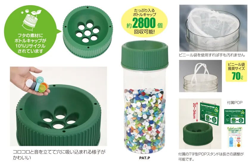 投入口の形状を工夫し、コロコロと中に入っていくキャップの様子を楽しめると同時に、ボディを透明にすることで、溜まっていくカラフルなキャップも回収器のデザインの一部として楽しめます。また、蓋のプラスチック素材の10%にボトルキャップを再利用しています。 見た目だけではなくスムーズに回収作業を行えるように、ビニール袋の取り付けが容易にできるアームや、回収をアピールするPOPスタンド(POP付き)も装備しており、ユーザーフレンドリーな設計となっています。